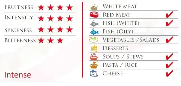 - Intense Coupage is een aromatische fruitige, zeer intense en complexe extra vierge olijfolie, doordrenkt met bloemige citrusgeuren en subtiele tonen van hooi. Frisse grasnotities en interessante hints van de vijgenboom verrijken de aroma's.